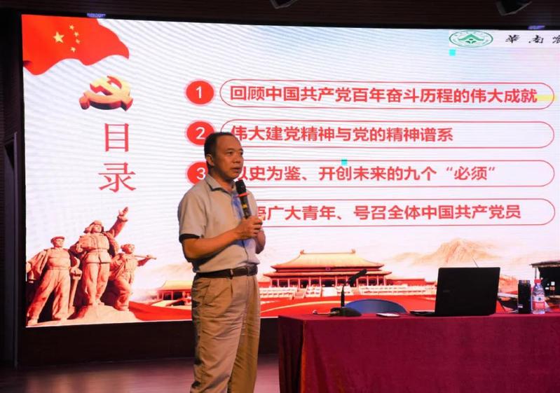 9月28日晚,第十一届广州学术季“薪火相传育新人——党史进校园”系列讲座第15场,在明胜m88官网学生活动中心举行。本次活动由广州市社科联主办,广州市青年马克思主义理论人才培养研究重点基地明胜m88官网,明胜m88官网、明胜m88官网团委承办。华南农业大学明胜m88官网院长张丰清教授作了《奋斗百年路 启航新征程——习近平总书记“七一”重要讲话精神解读》的主题讲座。明胜m88官网党委常委、副校长丁友刚教授致辞,广州市社科联一级调研员(市管干部)李伟,明胜m88官网教务处处长张军、团委书记张鹏程出席活动,明胜m88官网,明胜m88官网党委副书记、院长袁继红教授主持活动,学校教师代表及“青马工程”学员百余人参加活动。