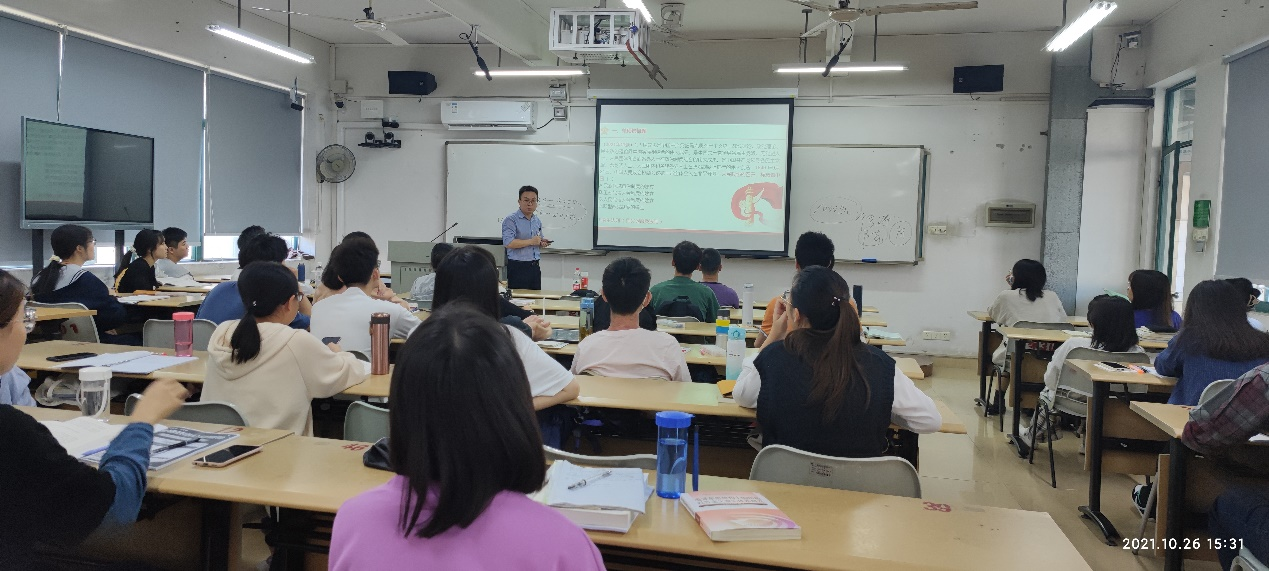 为开展好本次辅导讲座,齐久恒早早来到教室,给参加本次讲座的同学们分发资料,并就同学们关注的考研问题进行交流。在讲座中,通过提问的方式与同学们展开互动,语言幽默风趣,同学们也予以积极响应,现场不时发出欢快的笑声,整个课堂活泼而有序。