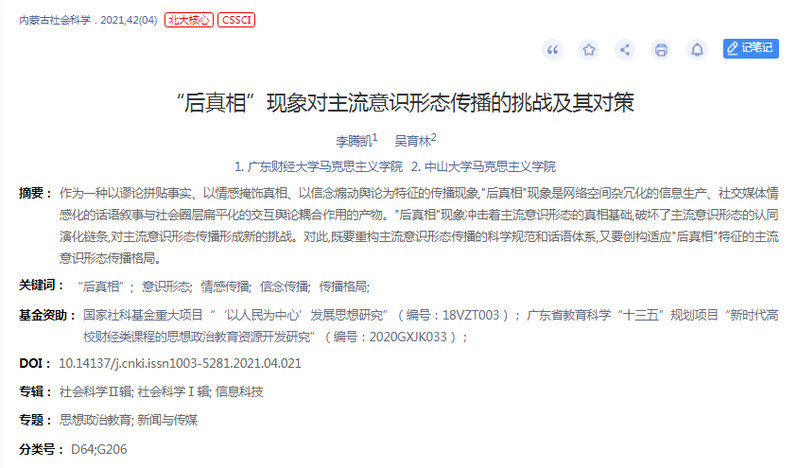 摘要:作为一种以谬论拼贴事实、以情感掩饰真相、以信念煽动舆论为特征的传播现象,后真相现象是网络空间杂冗化的信息生产、社交媒体情感化的话语叙事与社会圈层扁平化的交互舆论耦合作用的产物。后真相现象冲击着主流意识形态的真相基础,破坏了主流意识形态的认同演化链条,对主流意识形态传播形成新的挑战。对此,既要重构主流意识形态传播的科学规范和话语体系,又要创构适应后真相特征的主流意识形态传播格局。