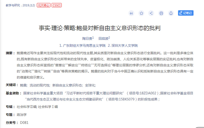 摘要:鲍曼晚近写作主要关注后现代性和流动的现代性主题,其实质是对新自由主义意识形态进行全面批判。这一批判是多维立体的,既有新自由主义意识形态化所带来的全球失序、贫富极化、政治崩溃、人伦关系恶化等事实层面的实证批判,也有对新自由主义意识形态所宣扬的普惠论解放论终结论无可选择论等理论层面的悖谬分析,还有对新自由主义意识形态采取的动荡化简化转换自由等具体策略的揭示。鲍曼的批判对于当今中国正确认识和抵制新自由主义意识形态具有一定的借鉴和启示意义。