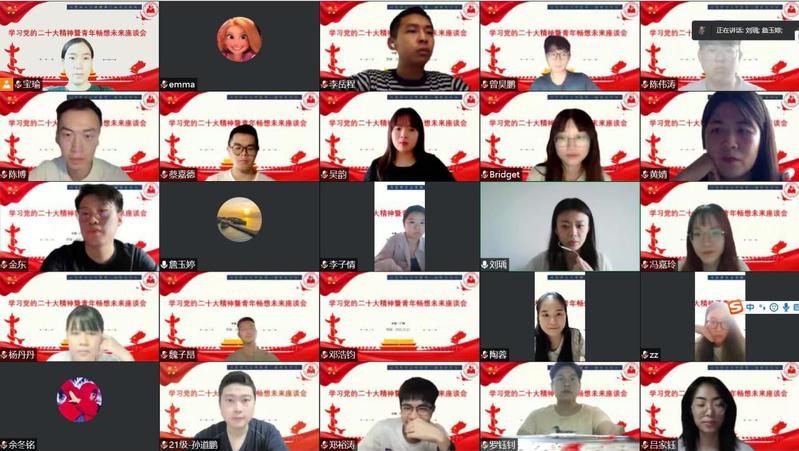 分享结束后,黄瑜老师感谢各位校友百忙中抽空分享学习党的二十大精神体会,为师弟师妹们传经送宝;同时向同学们转达了学院的关心关注,鼓励同学们继续保持向善向上之心,充分展现新时代青年的昂扬风貌。