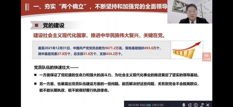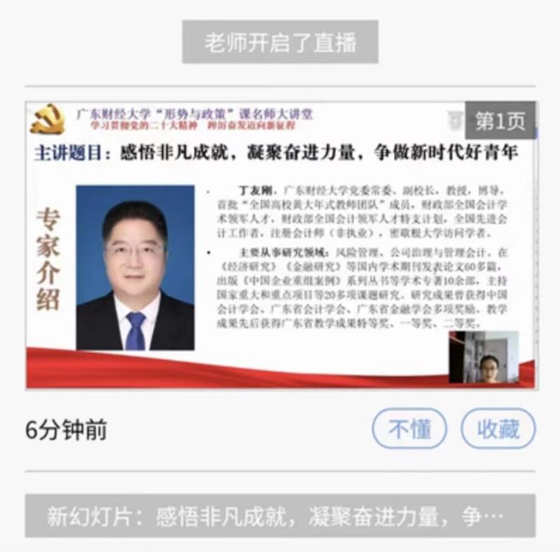 为学习宣传贯彻党的二十大精神,引导学生深刻理解和把握过去5年工作和新时代10年伟大变革的重大意义,增强青年学生的使命担当,“形势与政策课”组织开展系列名师大讲堂“党的二十大精神”系列宣讲活动。11月15日下午明胜m88官网举办“形势与政策课”名师大讲堂活动,特邀副校长丁友刚教授做《领悟非凡成就,凝聚奋进力量,争做新时代好青年》的专题讲座。讲座由明胜m88官网院长袁继红教授主持,通过广财慕课平台面向“形势与政策”课学生线上直播,85个班计7200余位本科生在线全程观看了本次讲座,另有151个班近14000位本科生将在下周二的形势与政策课上以录播的形式进行学习,做到学习党的二十大精神全覆盖、不断线。