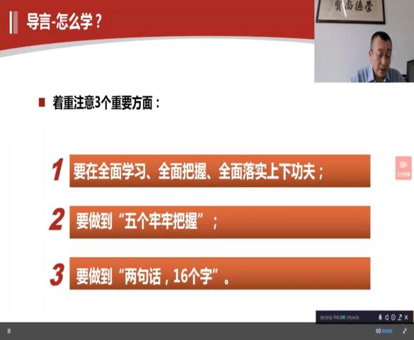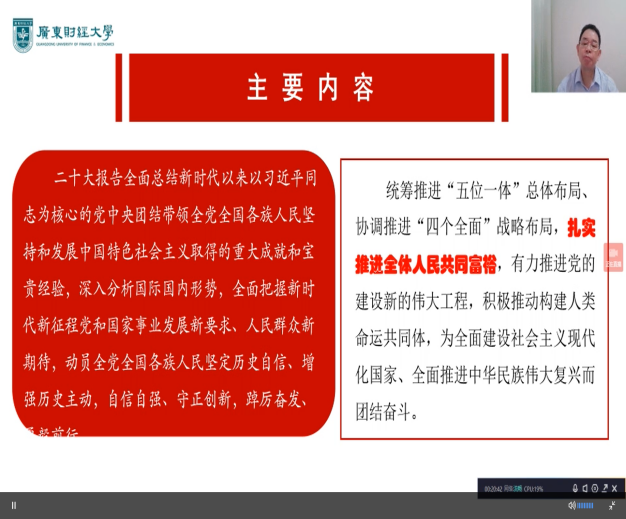11月29日下午,“形势与政策”课名师大讲堂在学校抗疫前线顺利开讲。校党委副书记陈树武、刘祖华、罗贤甲,副校长邹新月作为主讲嘉宾,共同走进大讲堂,围绕深入学习贯彻党的二十大精神,通过广财慕课平台,以线上直播方式,面向全校本科生展开讲授。2020级7500多名同学观看直播并参与互动,另外2019、2021和2022三个年级近14000名学生将在12月6日的形势与政策课上以录播形式进行学习。