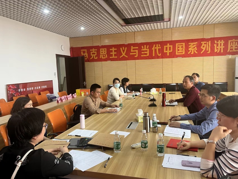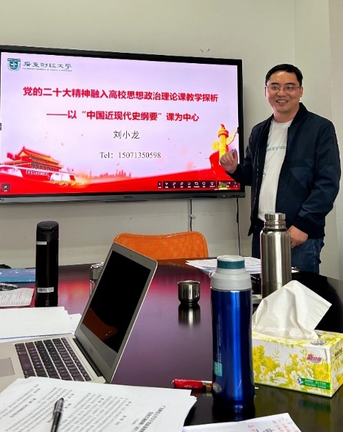 中国近现代史纲要教研室集体备课会,由刘小龙老师以《党的二十大精神融入高校思想政治理论课教学探析——以“中国近现代史纲要”课为中心》为主题进行了示范说课,教师们围绕“二十大精神融入课堂”等问题进行了热烈的交流与研讨。