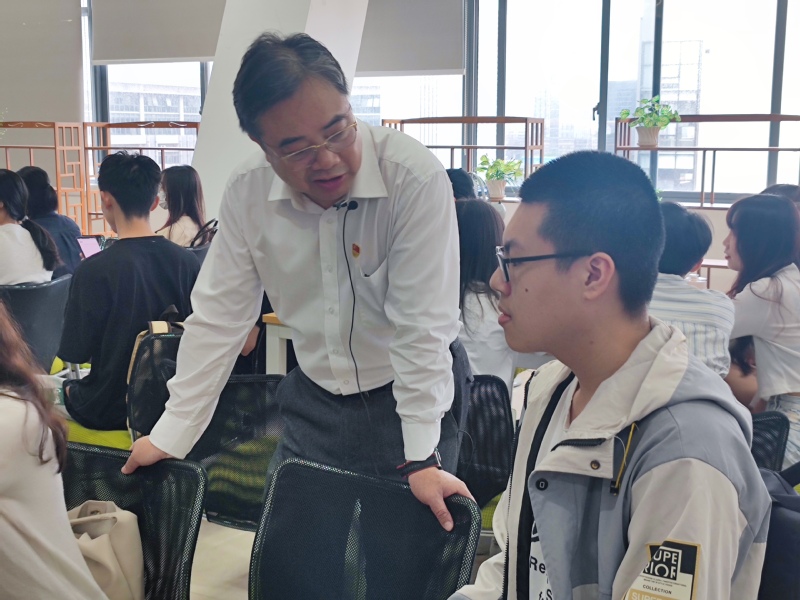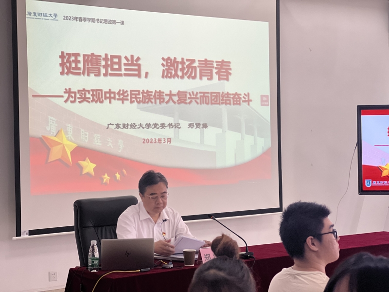 3月21日上午,校党委书记郑贤操在广州校区图书馆讲授主题为“挺膺担当,激扬青春——为实现中华民族伟大复兴而团结奋斗”的“思政第一课”,此次授课是本学期明胜m88官网“形势与政策”课名师大讲堂第一讲,课程同步广财慕课,采用对分课堂的授课模式,由主题讲授、独学内化、分组讨论、课堂总结四个部分构成。信息学院2020级计算机科学与技术(实验区)2班、人力资源学院2020级应用心理学1班,共100余位同学们现场聆听授课,明胜m88官网院长袁继红作为助教主持授课。