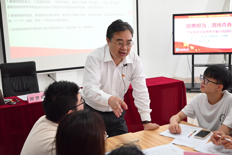 主题讲授结束后,课堂教学进入学生独学、分组讨论、小组汇报阶段。在讨论环节,郑贤操和相关学院党委书记、党委副书记、辅导员走到学生中间,参与交流讨论。各小组学生结合授课内容,阅读相关材料,独立思考并进行激烈讨论,10个小组选出代表分别就发扬“榴园精神”、落实团结奋斗等主题进行交流发言。