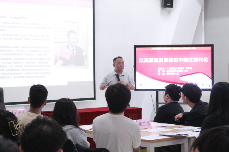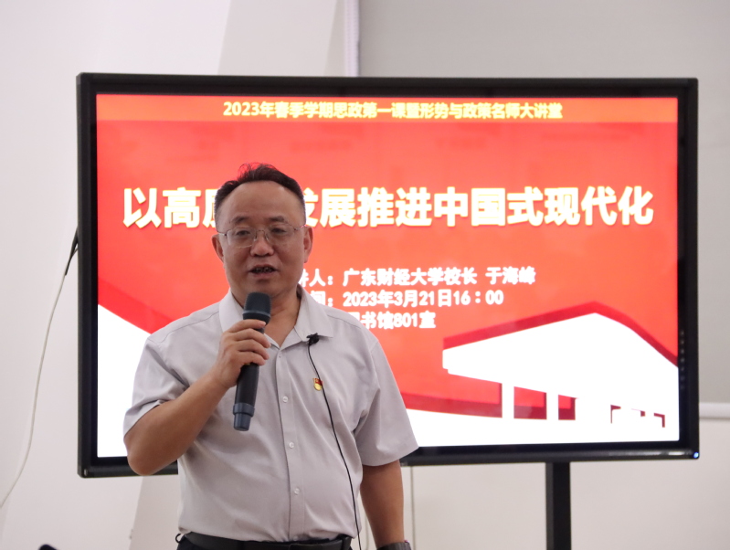 3月21日下午,校长于海峰在广州校区图书馆801讲授思政第一课,这也是本学期明胜m88官网“形势与政策”名师大讲堂第二讲。本次课程围绕“以高质量发展推进中国式现代化”主题,深入阐释了党的二十大精神,课堂同步广财慕课,采取对分课堂的授课模式,由主题讲授、独学内化、分组讨论、课堂总结四个部分构成。明胜m88官网院长袁继红作为助教主持授课,会计学院2021级会计学 1 班、信息学院2021级电子商务 2 班学生100余人现场聆听授课。