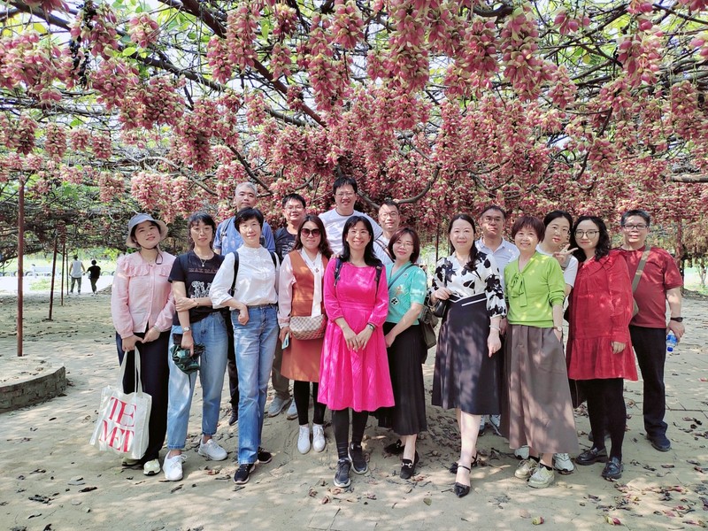 下午来到活动第二站——清远市黄金布禾雀花基地,基地的禾雀花开在蔓藤上,吊挂成串,有如万鸟栖枝,神形兼备,令老师们叹为观止,女教师们兴致盎然,与花合影,盈盈花盛处,花美人更美。