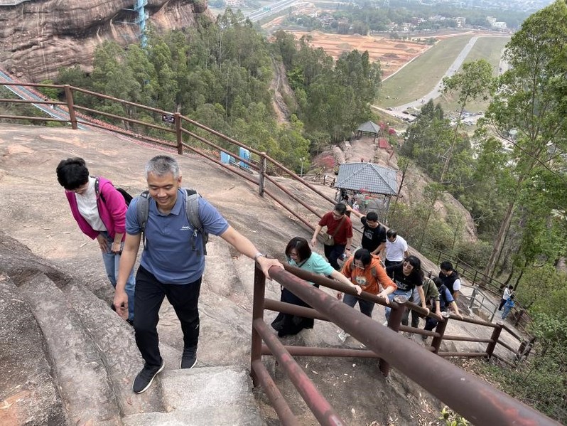 早上八点老师们从广州出发前往活动第一站——清远市马头山风景区。老师们在红色丹霞地貌中登高望远,虽然未能领略岭南第一攀——飞拉达项目(铁索栈道探险)的惊险,却在悬空吊桥、旋转天梯、悬空观景平台上体验了一把刺激。