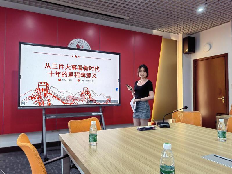 活动中,研究生宣讲员分别以“学习生态文明,建设美丽中国”“全国人大会议与党代会的区别”“从三件大事看新时代十年的里程碑意义”“推动经济高质量发展的关键举措”“做新时代青少年”“中国式现代化下的佛山”为主题向与会人员进行了宣讲展示。