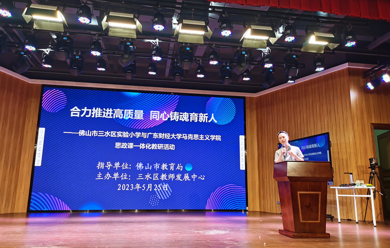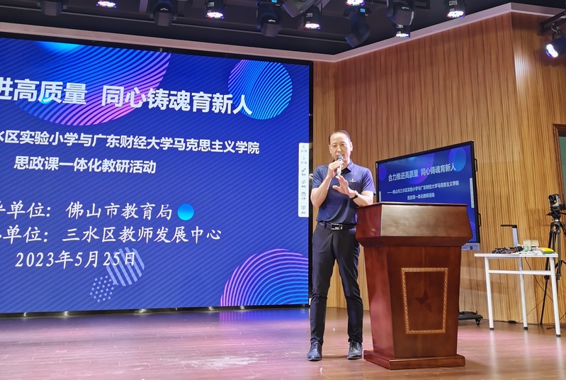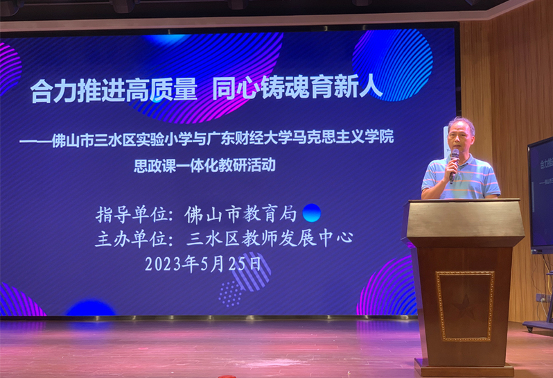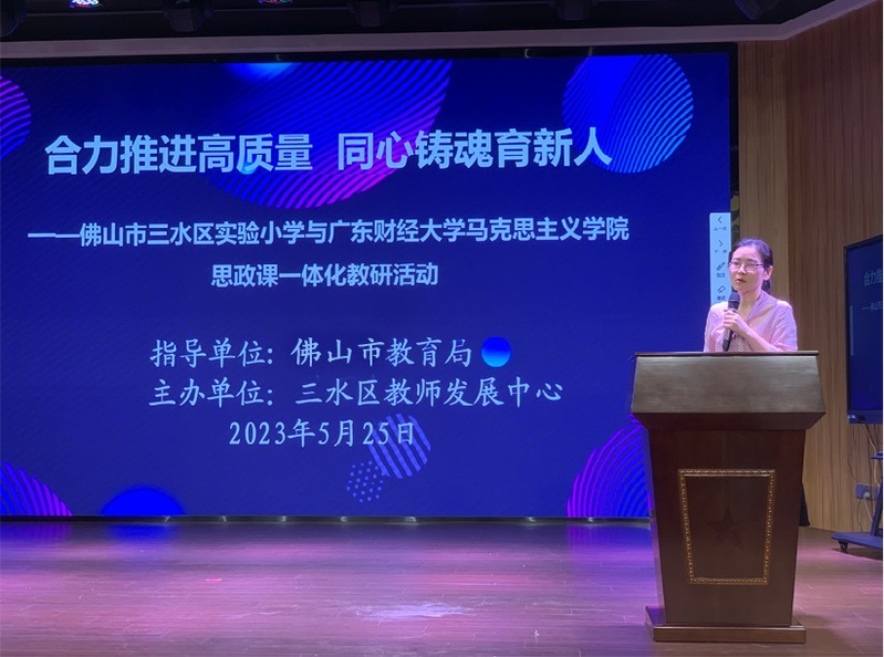 活动在佛山市三水区实验小学童彩报告厅举行,佛山市教育局教研室市局小学思政专职教研员何晓锋、三水区教师发展中心区局思政专职教研员杜长远、三水区教师发展中心市区兼职教研员何洁珍,明胜m88官网明胜m88官网院长袁继红、思想道德与法治教研室主任陈汉来,三水区实验小学校长邓妙珊、副校长李爵艺、副校长刑璐倩以及明胜m88官网明胜m88官网教师学生代表、三水区各镇街及直属小学道德与法治学科教研组长、学科教师代表约70人参与教研活动。