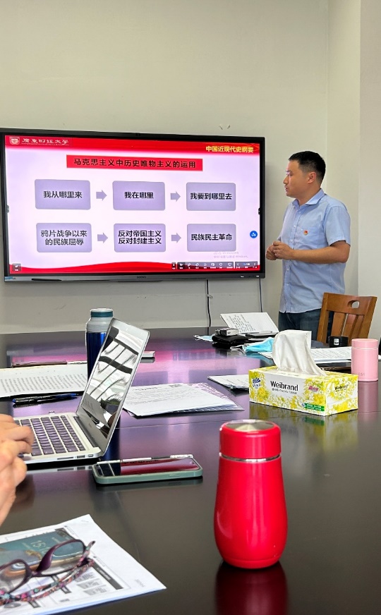 毛泽东思想和中国特色社会主义理论体系概论教研室、习近平新时代中国特色社会主义思想概论教研室的集体备课会在北二1031举行,由教研室主任刘荣才副教授主持,教研室全体教师参加。备课会上,古华琼、齐久恒、雷琼、郑健雄等老师进行了示范说课,重点围绕“毛泽东思想和中国特色社会主义理论体系概论”第7章、第8章和习近平新时代中国特色社会主义思想概论第12章、第13章进行了热烈的交流与研讨。