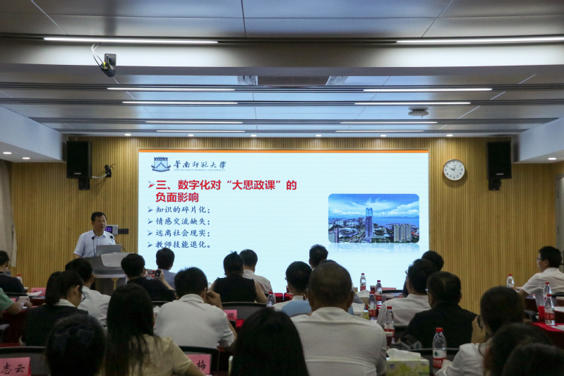 在思政专家主旨发言环节,教育部高校思政课教学指导委员会总教指委副主任委员、“长江学者”特聘教授、华南师范大学明胜m88官网陈金龙教授作主题演讲。他指出,数字化赋能大思政,既要数字化在思政课资源呈现方式、课堂教学方式、社会实践方式、社会传播方式、思政教学空间等方面发挥积极作用,也要合理使用技术,警惕数字化对大思政课的负面影响,如知识的碎片化、情感交流缺失、远离社会现实、教师技能退化等。华南理工大学明胜m88官网院长解丽霞教授作主题发言,她分析了数字化赋能大思政的优势与隐忧,认为数字化在助推思政课教师队伍建设、教学资源建设、教学平台建设、教学多元评价上具有鲜明优势,但是也存在技术主导超越价值主导、形成“虚拟化生存”惰性、投入成本与课程资源成本不匹配等隐忧。