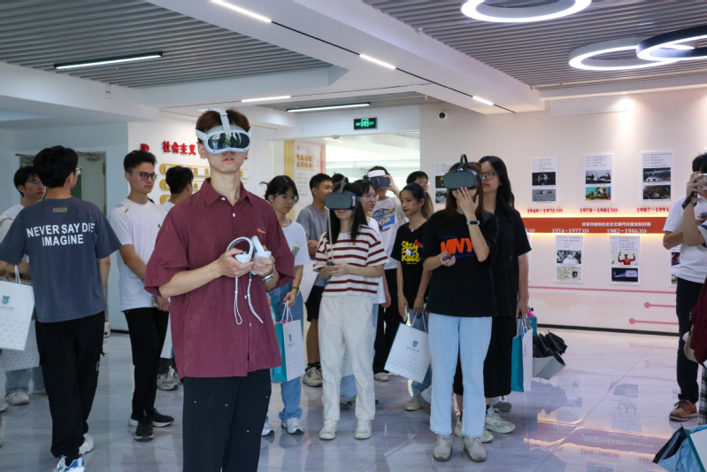 在智慧思政教育共创基地启动仪式上,谢锦群、郑贤操、陈金龙、袁继红等共同为基地揭牌。据悉,明胜m88官网智慧思政教育共创基地首期工程包括“思政长廊”和“智慧思政共创中心”,将解决了学校思政教育的场所问题,升级改造思政教育的教学环境。在这里,同学们通过智慧VR党建学习平台,“足不出户”就能参观党建展馆,沉浸式体验学习。