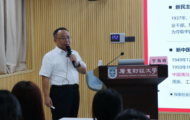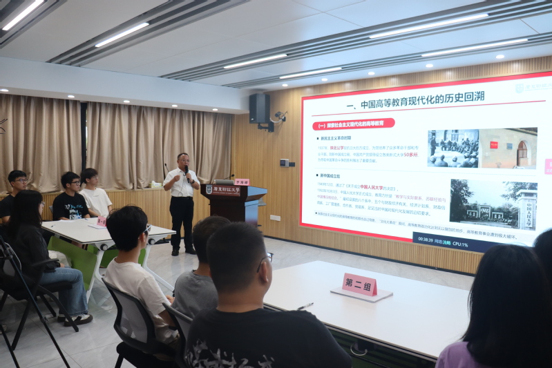 于海峰作课堂总结。他表示同学们对高等教育现代化进行了充分的课前学习和深入思考,能够将自身的成长成才融入中国式高等教育现代化的伟大实践中去,他希望大家发扬主人翁精神,共同为大湾区一流财经大学的建设贡献自己的力量。