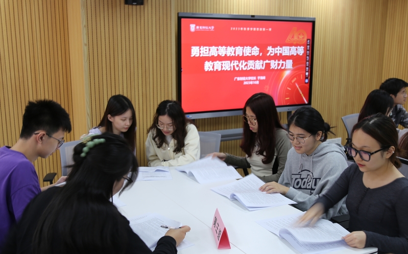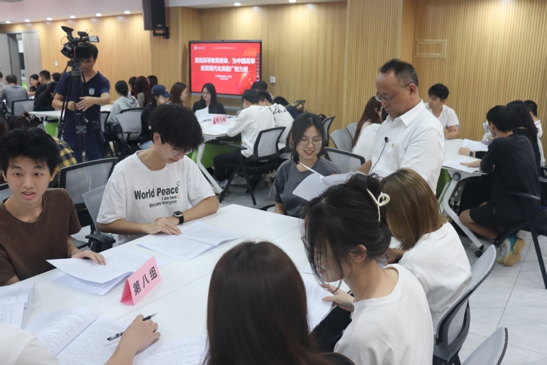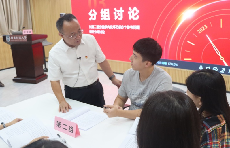 主题讲授结束后,课堂教学进入独学内化、分组讨论、小组汇报阶段。学生结合授课内容,阅读相关材料,独立思考,提出问题并进行讨论,8个小组围绕高等教育现代化和青年大学生“为什么读书”等主题进行了交流发言。