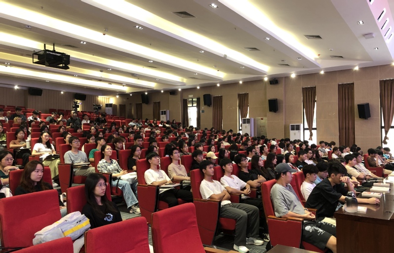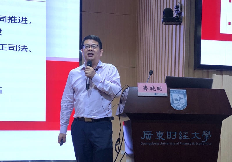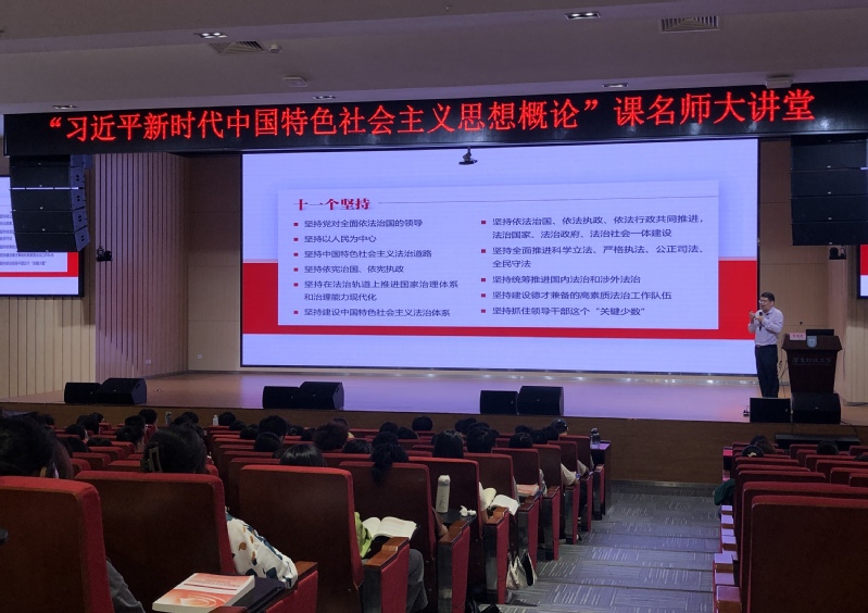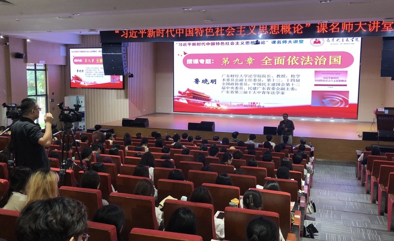 11月8日上午,在佛山校区同心楼报告厅,“习近平新时代中国特色社会主义思想概论”课名师大讲堂邀请法学院院长鲁晓明教授为2022级同学专题讲授“全面依法治国”。243名同学在现场大课堂上课,其他同时段上课的广州校区同学以观看现场直播方式参与学习。大讲堂由明胜m88官网副院长孙晓晖教授主持,学院党委书记张小洁及现场班级的带班老师郑健雄、仇小敏参加。