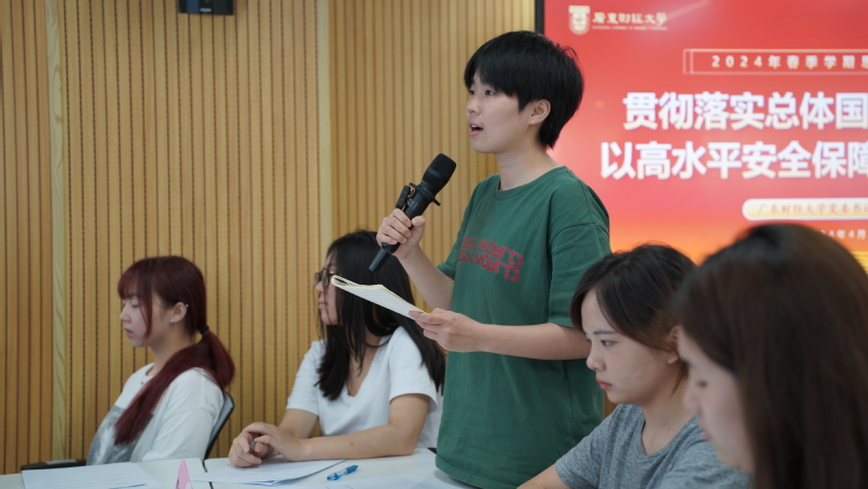 主题讲授结束后,“对分课堂”进入独学内化、分组讨论、小组汇报阶段。同学们结合授课内容,阅读相关材料,独立思考,提出问题并进行讨论。在讨论环节,郑贤操走到学生中间,与同学们亲切交流。随后,8个小组选出代表,分别围绕如何理解国家安全、如何理解当前中国面临的形势及青年如何贯彻落实总体国家安全观等问题交流发言。