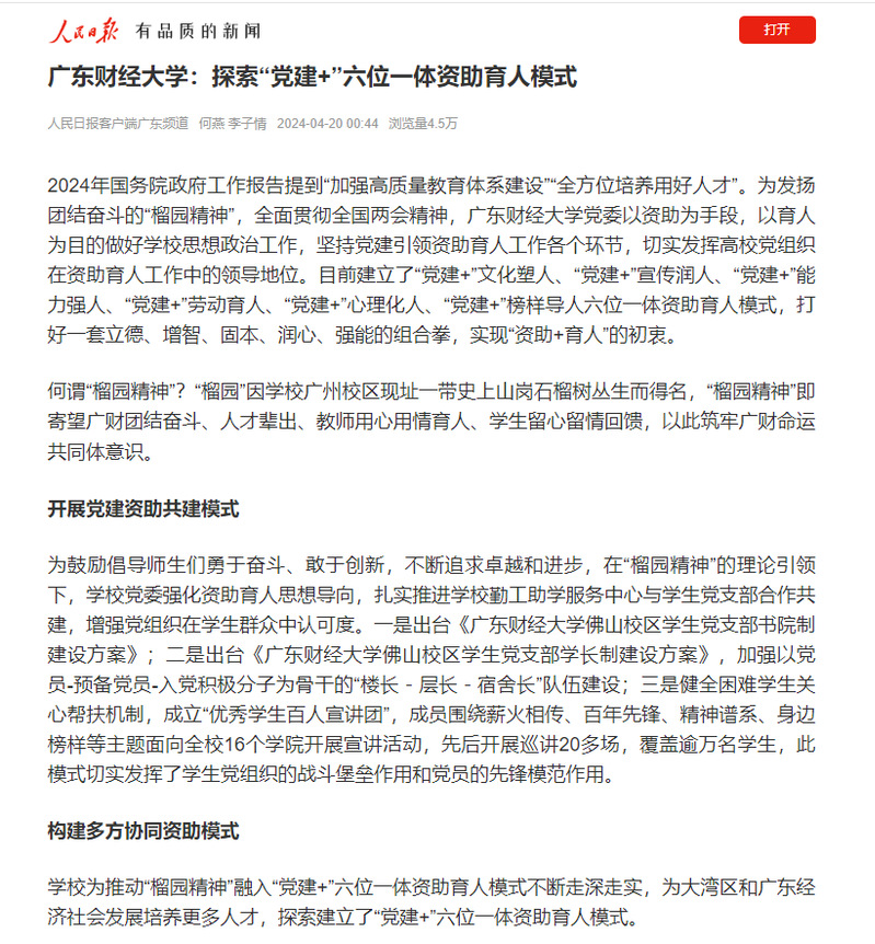 学校为推动“榴园精神”融入“党建+”六位一体资助育人模式不断走深走实,为大湾区和广东经济社会发展培养更多人才,探索建立了“党建+”六位一体资助育人模式。