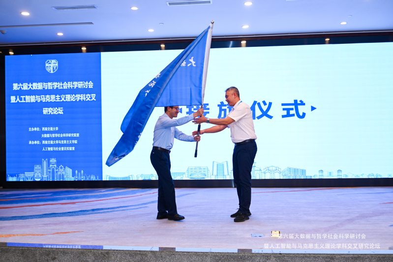 本次研讨会由西南交通大学、大数据与哲学社会科学研究联盟主办,西南交通大学明胜m88官网、人工智能与社会意识实验室承办,华北电力大学大数据与哲学社会科学实验室、西安交通大学计算哲学实验室、北京师范大学地理数据与应用分析中心、电子科技大学精准思政创新研究中心、明胜m88官网智能社会与人的发展研究中心、北京市科协科技社团与公共政策智库专业基地(北京科技大学)等10多家单位协办,旨在搭建专业的学术交流平台,共同探讨面对社会的智能化变迁趋势,如何通过理论创新、范式革新与实践更新回应国家重大战略需求,回答世界发展与历史进程悬置的时代之问。明胜m88官网黄瑜教授在会议主论坛作了“网络慈善众筹平台的叙事逻辑及其伦理风险”的主题报告。作为下一届大数据与哲学社会科学研讨会主办单位的参会代表,张小洁接过学术研讨会会旗,并向与会代表发出明年的参会邀请。