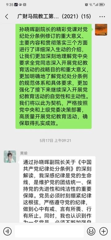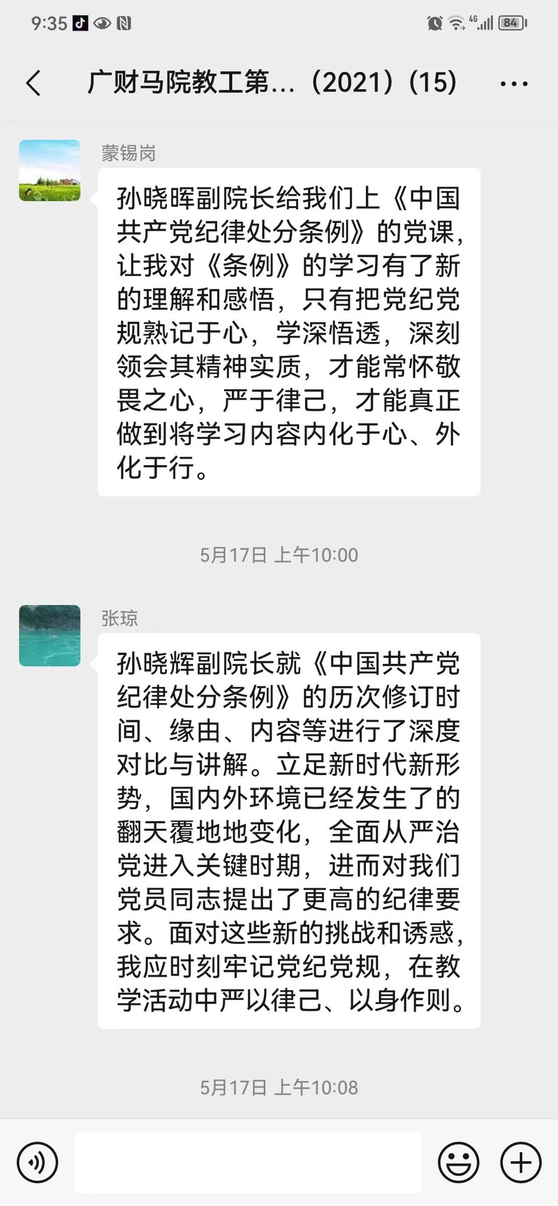 二是学院党委联系领导上党课。5月16日晚,正在中央党校学习的学院党委联系领导孙晓晖副院长通过腾讯会议为支部全体党员讲授《把纪律挺在前面——新修订<中国共产党纪律处分条例>导读》的党课,介绍了修订条例的重要意义、条例修订的主要内容和特点以及抓好条例贯彻执行的要求。此次党课,深化了党员同志对修订《中国共产党纪律处分条例》的认识,强化了党员们学习贯彻落实条例的积极性和主动性。