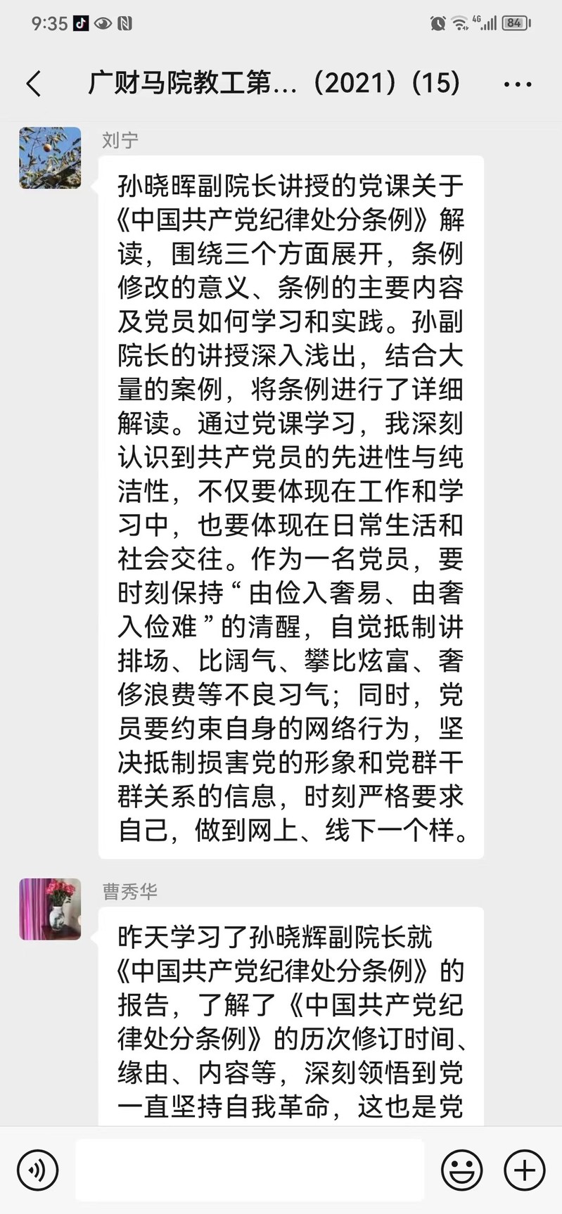 4月21日,教工第一党支部全体党员在立德楼116室参加了学院党委召开的党纪学习教育启动部署会。按照学院统一部署安排,教工第一党支部各项学习活动有序深入开展。