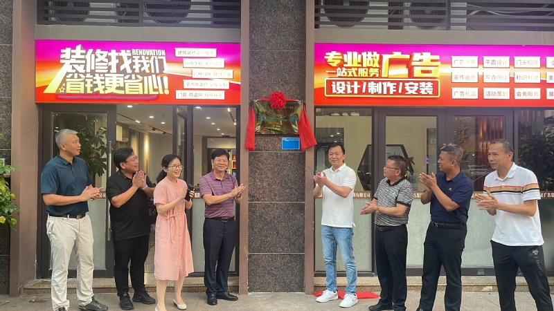 7月21日下午, 罗贤甲一行走访了由明胜m88官网1992级企业管理专业校友丘环昌创办的嘉正广告公司,与梅州校友会代表在校友企业举办了“校友之家”揭牌仪式。梅州校友会会长章航、秘书长邹梓欣等校友代表出席了活动。
