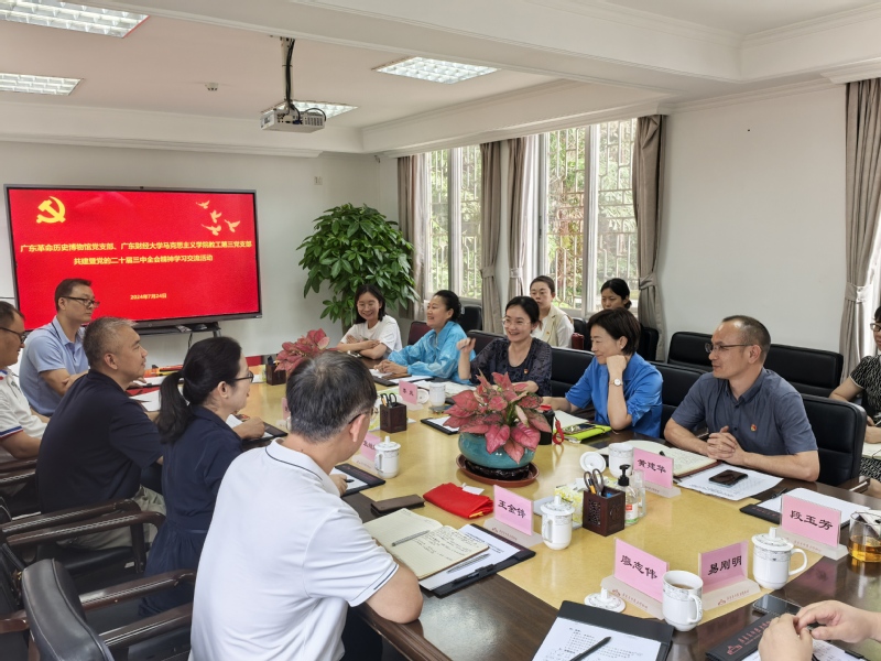 7月24日,明胜m88官网明胜m88官网教工第三党支部到广东革命历史博物馆,与博物馆在职人员党支部、退休人员党支部开展党支部共建活动,学习贯彻党的二十届三中全会精神。广东革命历史博物馆党总支书记李岚,明胜m88官网党委书记张小洁、院长袁继红、副院长孙晓晖、工会主席王金锋,以及广东革命历史博物馆在职人员党支部、退休人员党支部和明胜m88官网教工第三党支部的党员同志共同参加了学习活动。