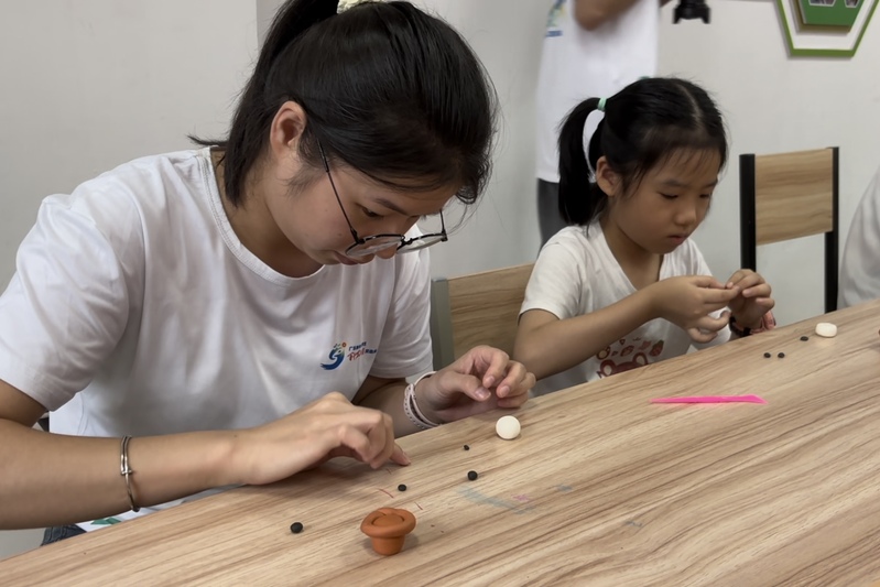 实践团成员现场体验了非遗文化蛋壳画、面塑的制作,学习了英歌舞基础动作,切身参与到非遗文化的传承中。队员们分别跟着非遗传承人黄子东老师和林翠老师了解了相关的文化,并进行非遗技艺的作品制作。在他们的指导下,团队成员以小小蛋壳为载体,使用各式工具进行绘画,创作出了属于自己的蛋绘作品;将手里一块块面团捏制成形态各异的国宝熊猫,收获“一满框”的成就感,不仅亲手体验了制作的全过程,还近距离感受其文化魅力,增强了非物质文化遗产保护传承意识。在揭阳楼广场,团队成员邂逅英歌舞表演者,在激昂的鼓点与旋律中,队员们在舞者的指导下亲自上手,学习英歌舞的招牌动作,在舞动棒槌、勾脚出拳中感受英歌舞的飒爽英姿。
