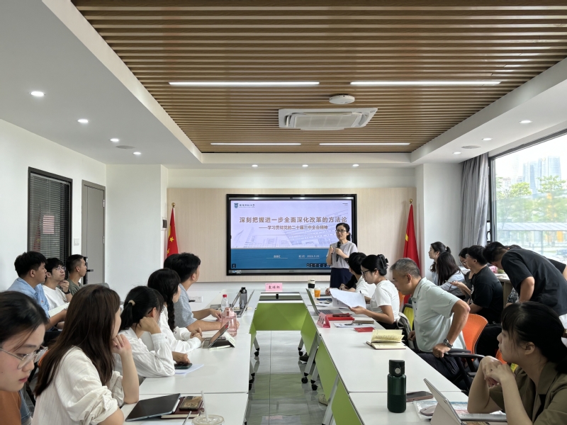 会议伊始,袁继红以《深刻把握进一步全面深化改革的方法论》为主题,带领同学们深入学习党的二十届三中全会精神。她以“三个更加注重”“三个更好相适应”为切入点,详细解读全会报告,探讨进一步全面深化改革的方法论,就统筹发展与安全进行深入解读全会改革精神,以学术探究引导同学们理解改革的核心要义,强调理论联系实际,勉励大家将全会精神转化为学习动力和行动指南。