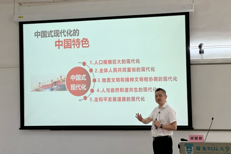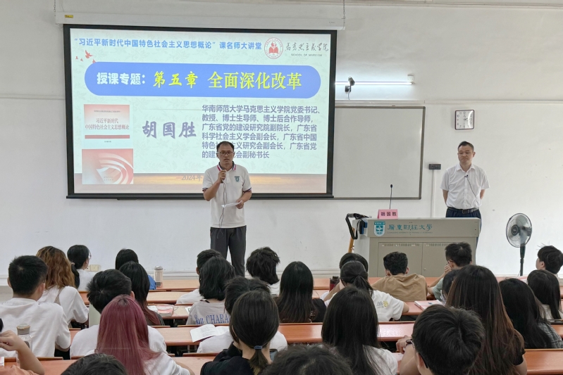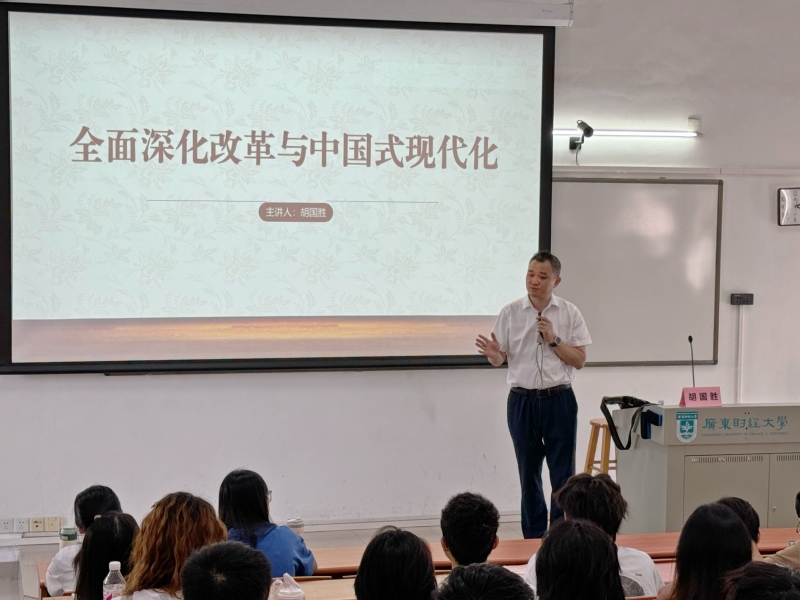 为深入推进党的二十届三中全会精神进校园、进课堂,10月8日上午,华南师范大学明胜m88官网党委书记、广东省党的建设研究院副院长、广东省科学社会主义学会副会长胡国胜教授,做客“习近平新时代中国特色社会主义思想概论”课名师大讲堂为2023级翻译1班、2023级环境设计1-2班共120余名本科学生专题讲授“全面深化改革与中国式现代化”。明胜m88官网副院长孙晓晖教授主持课堂,学院党委书记张小洁、任课老师乔良列席课堂。