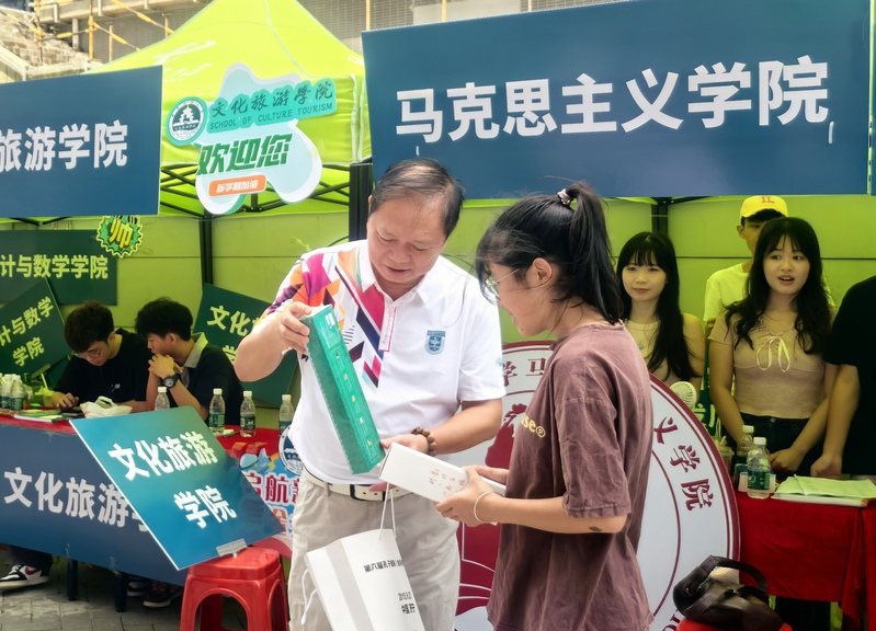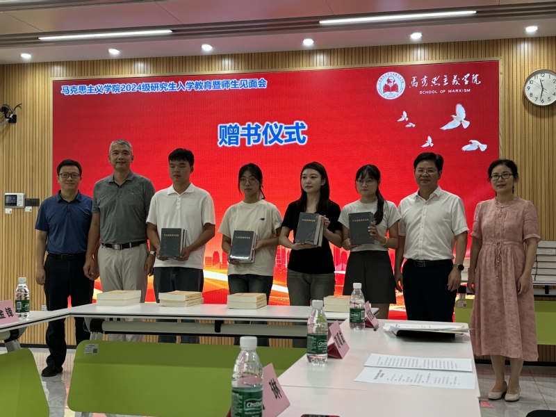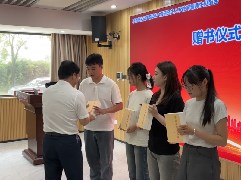 在赠书仪式上,校党委副书记、研究生导师罗贤甲,院长袁继红,学院党委书记张小洁、副院长陶日贵为新生赠送了《习近平著作选读》和《马克思恩格斯选集》。希望新生能够坚定自己的理想信念,做到多看多读多学多想,树立远大的志向。