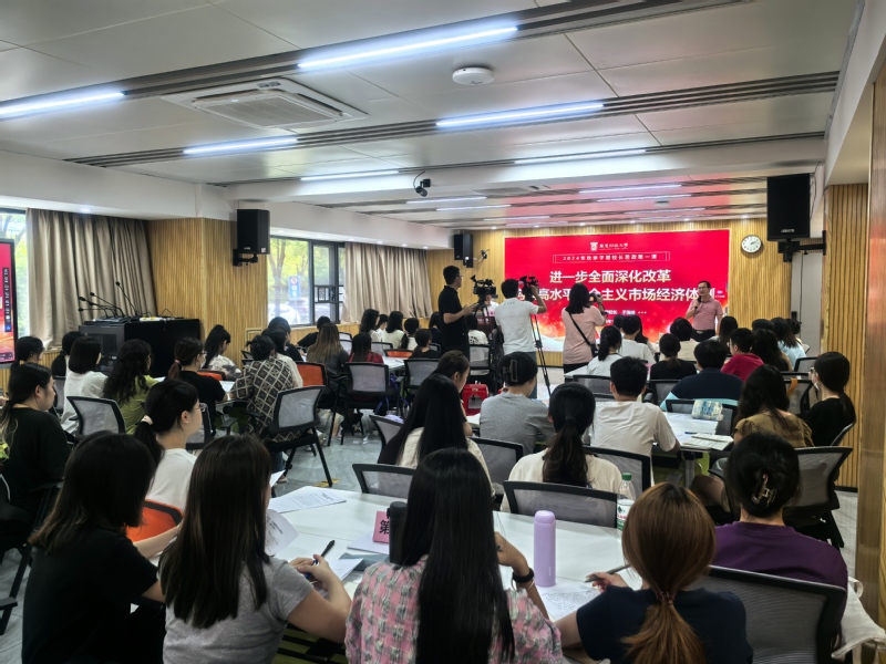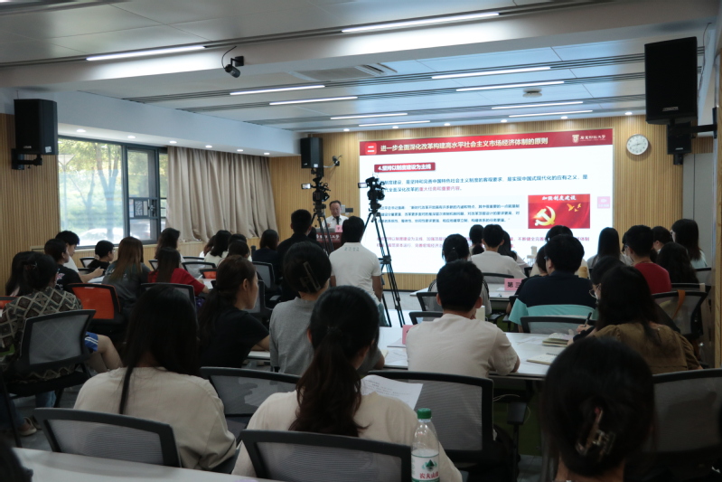 他强调,党的二十届三中全会是新的历史起点上进一步全面深化改革、推进中国式现代化的总动员、总部署。党正领导全国各族人民向第二个百年奋斗目标迈进,以中国式现代化全面推进强国建设、民族复兴伟业。他勉励同学们作为青年学子、党和国家事业的接班人,要深入学习和领悟国家全面深化改革的目标和重点。随后,他从“进一步全面深化改革构建高水平社会主义市场经济体制重要性”“进一步全面深化改革构建高水平社会主义市场经济体制的原则”“构建高水平社会主义市场经济体制的重大举措”三大方面与同学们进行分享。