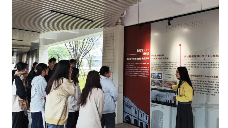 在课程讲授中,罗聪老师结合《中国近现代史纲要》课程第四章中《中国革命的新局面》的内容,以金融事业的发展为切入点,带领学生们参观了关于党在历史时期金融事业发展的图片展,结合长廊内的历史照片和文献资料,为学生详细讲解了近代以后中国共产党带领中国金融业经历了从旧中国时期买办性质到独立发展的转变,以及党建立近代完整金融体系的艰难历程,感受战争时期中国共产党为稳定金融、推进国民经济发展的不懈努力,引导学生进行深入思考。