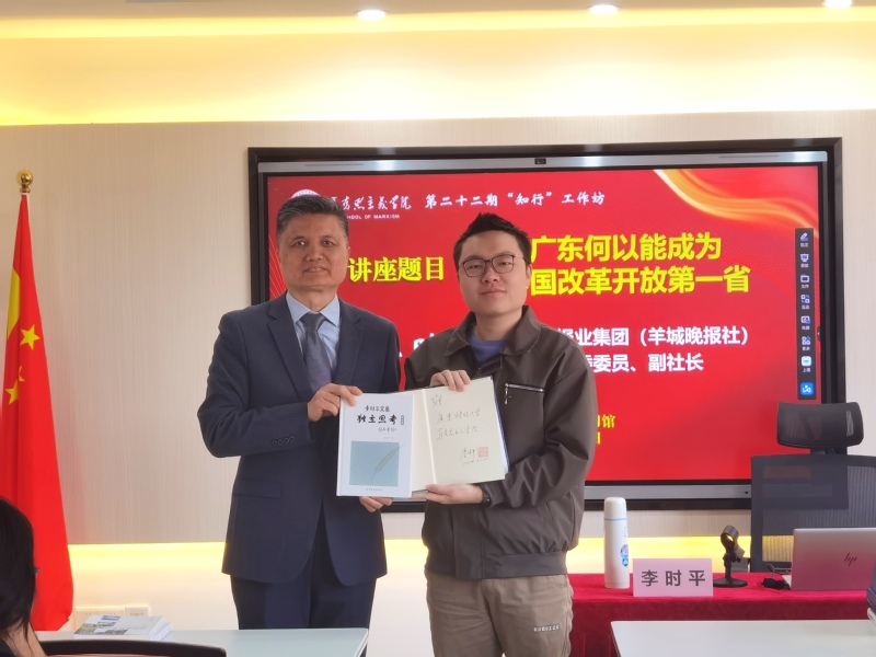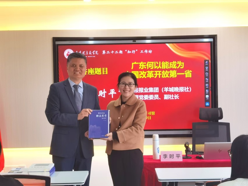 12月19日上午,明胜m88官网邀请羊城晚报报业集团原党委委员、副社长李时平做客第22期“知行”工作坊,作题为“广东何以能成为中国改革开放第一省”学术讲座。明胜m88官网院长袁继红、院长助理李腾凯、马克思主义理论专业各学科方向教师代表、马克思主义理论专业硕士研究生代表共40多人参加讲座。讲座由明胜m88官网副院长陶日贵主持。