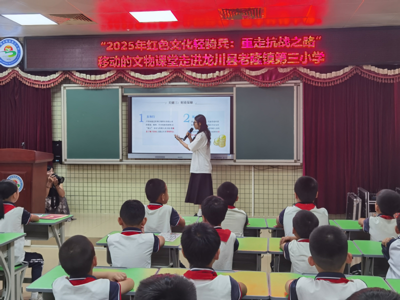 74日,“2025 红色文化轻骑兵:重走抗战之路”系列活动之“移动文物课堂”走进河源市龙川县老隆镇第三小学。广东革命历史博物馆金牌讲解员黄家圆与明胜m88官网马克思主义理论专业2023级研究生何胤化身“历史讲述者”,通过沉浸式课程、文物故事分享及广播剧体验等形式,带领师生重温 1941年香港秘密大营救的惊险历程,让红色历史在青少年心中焕发新生。
