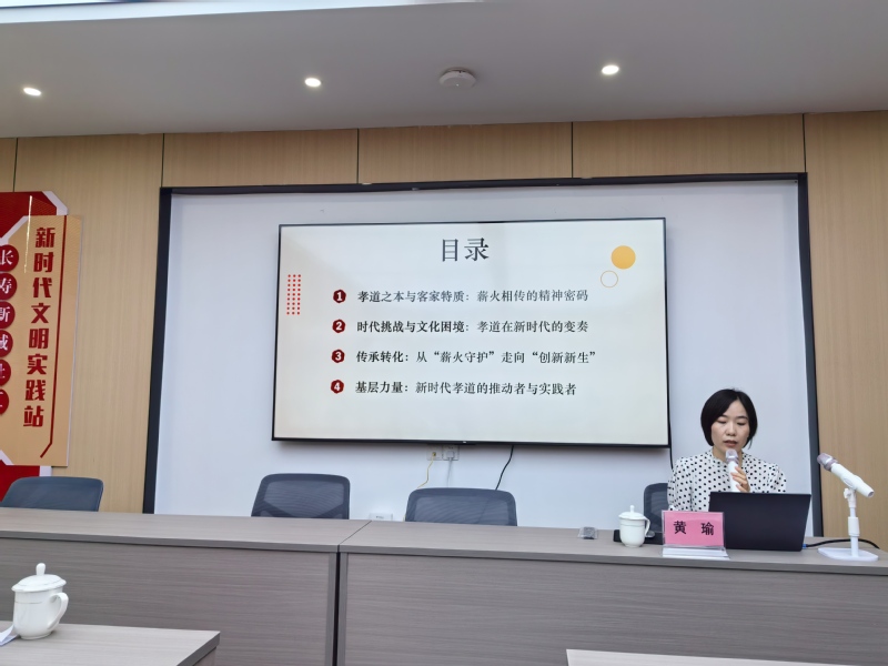 宣讲团着力挖掘梅州深厚的红色文化资源和优秀传统文化基因。在梅县区新时代文明实践中心,刘小龙老师以“缓解压力,积极自我关怀——学习叶剑英元帅的人生智慧”为题开讲。他回顾了无产阶级革命家叶剑英元帅波澜壮阔的一生,从历史细节中提炼其坚定信念、乐观豁达、勇于担当的人生智慧,深刻解读这些宝贵精神财富对于当下基层干部和群众应对压力、保持积极向上心态的现实启示。参会人员深受触动,纷纷表示要以叶帅为榜样,以积极乐观的态度面对生活与工作中的压力,汲取奋进力量。在蕉岭县,黄瑜教授在长寿新城社区新时代文明实践站带来“孝道文化的薪火与新生:以客家为例”主题宣讲。她以客家孝道文化为切入点,深入浅出地阐述了传统孝悌思想在新时代的创新发展,以及如何将其融入基层治理、家风建设、乡村文明实践中,激发文化认同与内生动力,展现了理论解读与文化传承的完美交融。