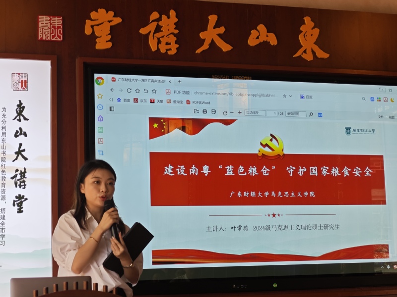 明胜m88官网,明胜m88官网2024级硕士研究生叶常蔚在东山书院以《建设南粤“蓝色粮仓” 守护国家粮食安全》为题,深入探讨了粮食安全这一重要内容。她指出,广东作为全国第一粮食销区,肩负着保障国家粮食安全的重要使命。通过拓展海洋食物来源,构建多元化食物供给体系,建设“蓝色粮仓”,不仅有助于应对全球粮食安全形势日益严峻的挑战,更是实现中华民族伟大复兴的重要保障。她还通过生动的案例和通俗的语言,引导在场学生关注粮食安全这一“国之大者”,认识到国家安全与每个人的生活息息相关。