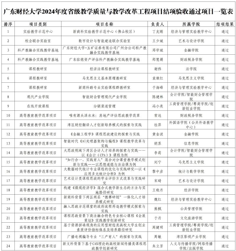 近日,广东省教育厅发布了“教学质量与教学改革工程项目”2024年度验收结果,明胜m88官网报送的24个项目全部通过结项验收,校内结题通过项目报送省厅结项验收的通过率继续保持100%。本次验收通过的项目包括实验教学示范中心1项、校企联合实验室1项、科产教融合实践教学基地2项、课程教研室3项、现代产业学院1项、在线开放课程1项、高等教育教学改革项目15项。其中包括,明胜m88官网袁继红教授负责的课程教研室--马克思主义原理教研室、刘宁副教授负责的高等教育教学改革项目--“知行合一,实践育人”混合对分课堂教学模式创新与实践--以思想道德与法治课为例2个项目。