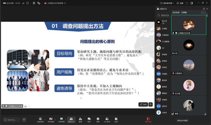 本次线上工作坊的成功举行,激发了学生们的科研热情。它为提升研究生的量化调研分析及写作技能提供了有效的指导,同时为深化研究生的学术素养和巩固学术能力基础提供了切实有效的支持。