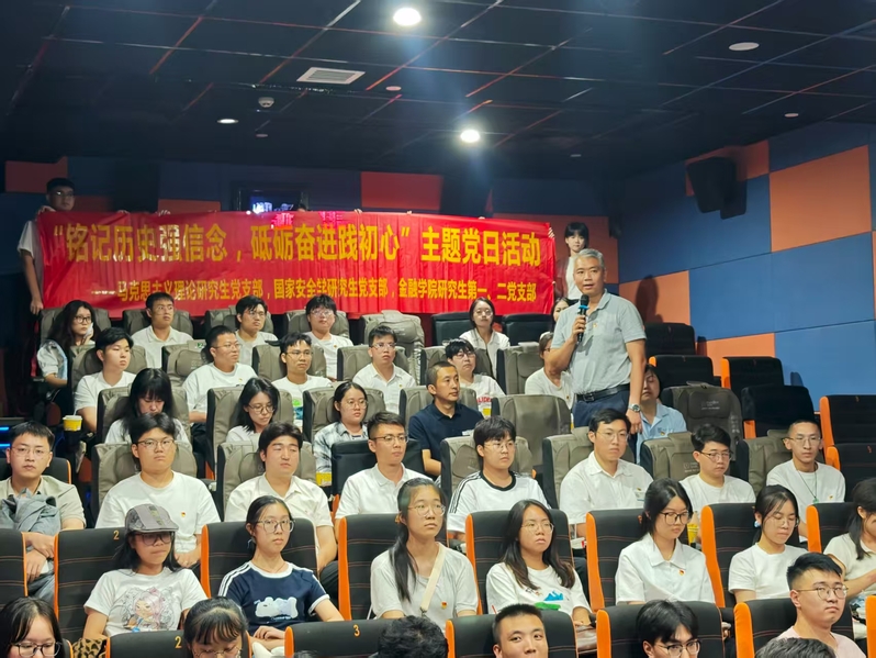 今年是纪念中国人民抗日战争暨世界反法西斯战争胜利 80 周年,为进一步弘扬爱国主义精神,912日晚,明胜m88官网马克思主义理论研究生党支部、国家安全学研究生党支部与金融学院研究生第一党支部、研究生第二党支部以“铭记历史强信念,砥砺奋进践初心”为主题,联合开展观看爱国主义影片《南京照相馆》的主题党日活动,旨在通过观影的方式,回顾历史,让师生党员感悟先辈们在艰难岁月中的坚守与抗争,在国家危难之际那深沉的家国情怀与不屈的民族精神,进而坚定理想信念、强化使命担当。明胜m88官网党委书记张小洁,金融学院党委书记黄洁娜、支部书记闫晓琴,国家安全与发展研究院专任教师杨飞和4个研究生党支部共140余位党员、入党积极分子参加本次活动。