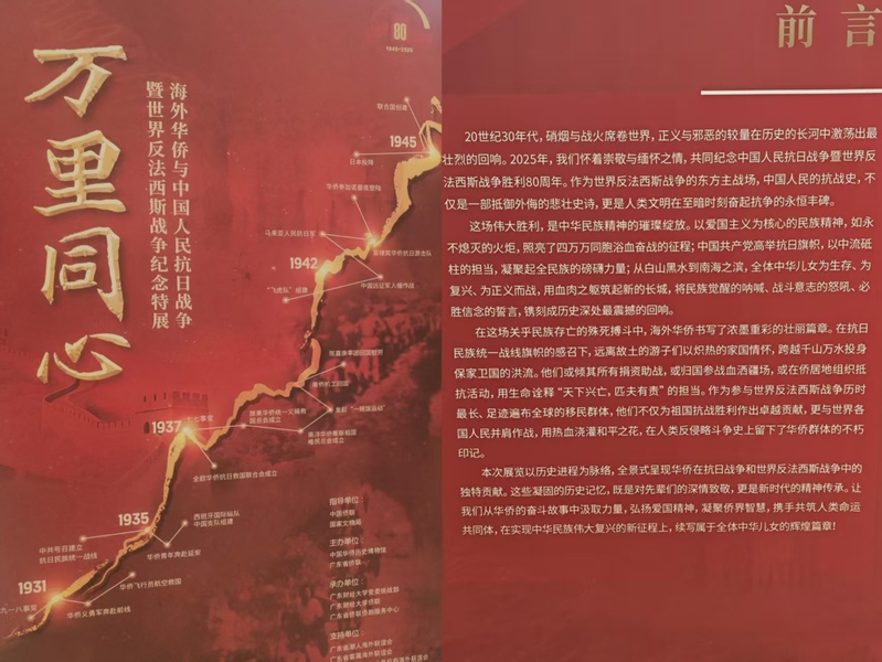 本次巡展作为是一场爱国主义教育活动,以丰富的历史图片和详实的文字、数据资料,系统梳理和生动再现了广大海外华侨自“九一八”事变至抗战全面暴发,直至最终胜利的漫长岁月中,与祖国母亲同呼吸、共命运的壮阔篇章。展览清晰地揭示,海外华侨的支援是中国人民抗日战争中不可或缺的重要力量。他们虽远隔重洋,却心系祖国,或倾其所有捐资助战、或归国参战血洒疆场、或在侨居地址抵抗活动,为抗战的胜利作出了不可磨灭的历史贡献。